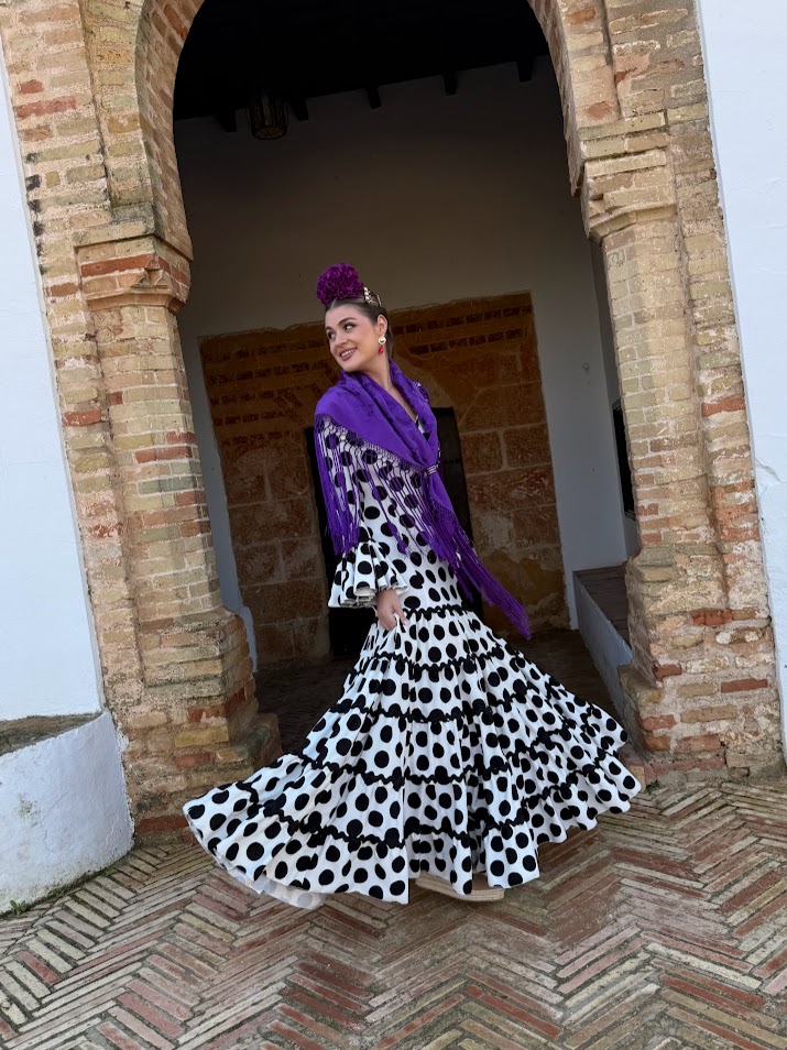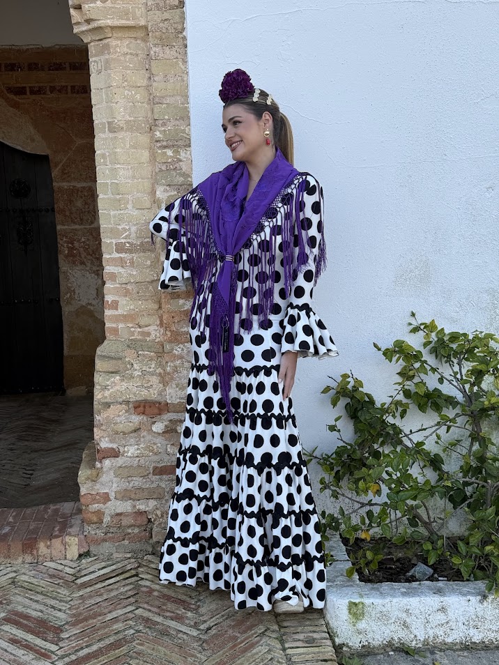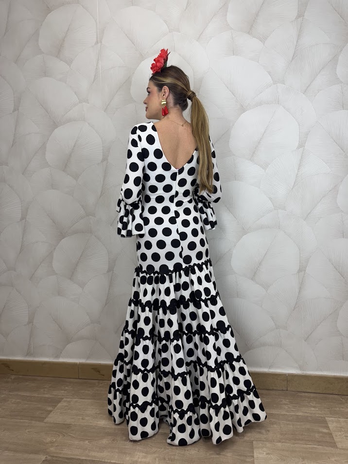DESCRIPCION : Traje de flamenca confeccionado en punto elástico (92% poliéster, 8% elastano). Este modelo lleva el talle ajustado hasta debajo del pompis y faldón canastero de cinco cortes con ondulinas anchas de color negro en cada unión.