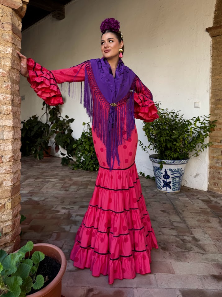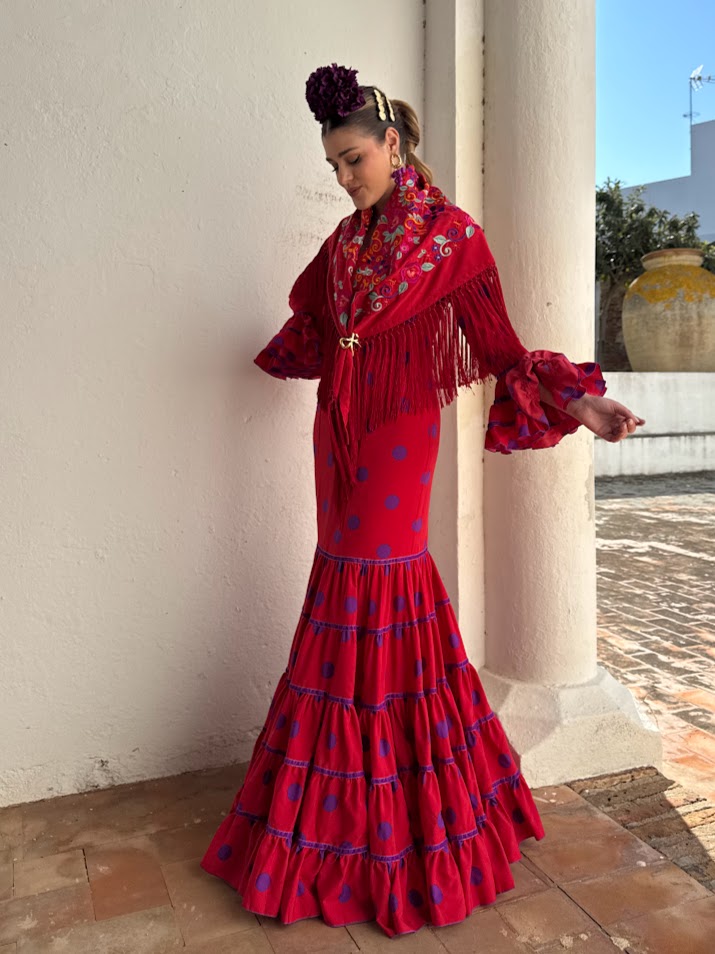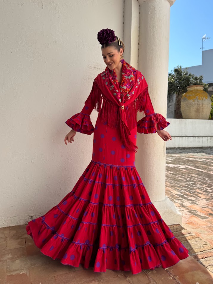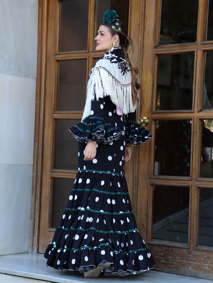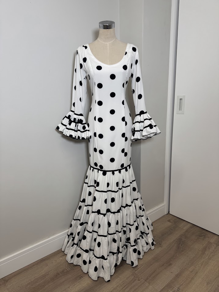 DESCRIPCIÓN : Traje de flamenca confeccionado en popelín fino (100% poliéster). Tiene el talle ajustado hasta mitad del muslo, maga larga y faldón canastero de cinco cortes con cintas de terciopelo en las uniones. Este modelo lleva enagua de popelín y bolsillo, además de costura para sacarle a los costados.
