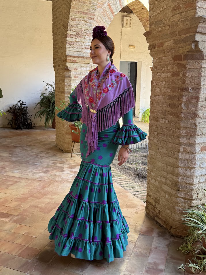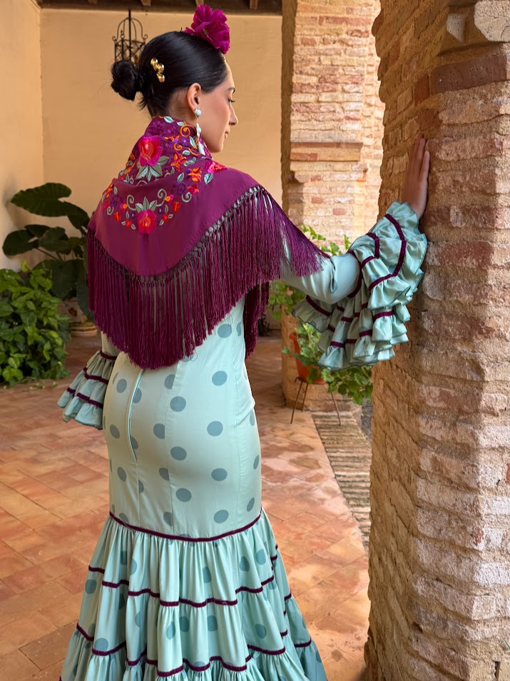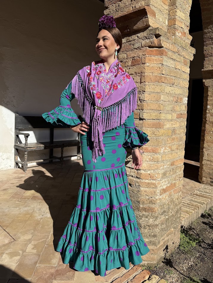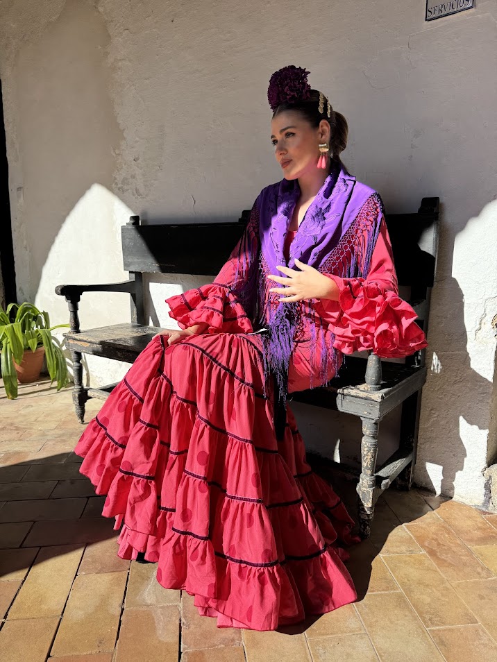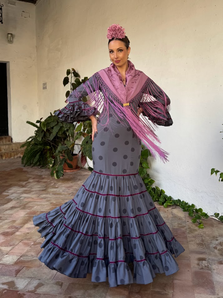DESCRIPCIÓN : Traje de flamenca confeccionado en popelín fino (100% poliéster). Tiene el talle ajustado hasta mitad del muslo, maga larga y faldón canastero de cinco cortes con cintas de terciopelo en las uniones. Este modelo lleva enagua de popelín y bolsillo, además de costura para sacarle a los costados.